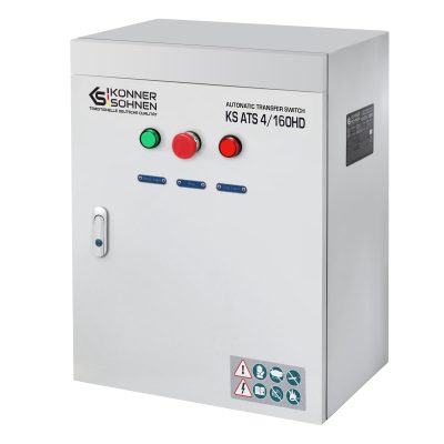 Unitatea KS ATS 4/25 Gasoline ATS (Automatic Transfer Switch) de la brandul german „Könner & Söhnen” pornește automat generatorul și transferă sarcina către acesta atunci când sursa principală de alimentare este oprită și oprește automat generatorul atunci când alimentarea centrală este restabilită. Este compatibilă cu generatoarele pe benzină de tip invertor care sunt echipate cu un conector cu 8 pini pentru o unitate de comutare automată (intrare ATS). Unitatea ATS are un PLC pentru programarea timpului de pornire a motorului după întreruperea alimentării, timpul de încălzire a motorului înainte de conectarea consumatorilor de energie, precum și pentru semnalizarea erorilor. Dispune de un buton de oprire de urgență a generatorului. Unitatea ATS poate funcționa atât în mod automat, cât și în mod manual.