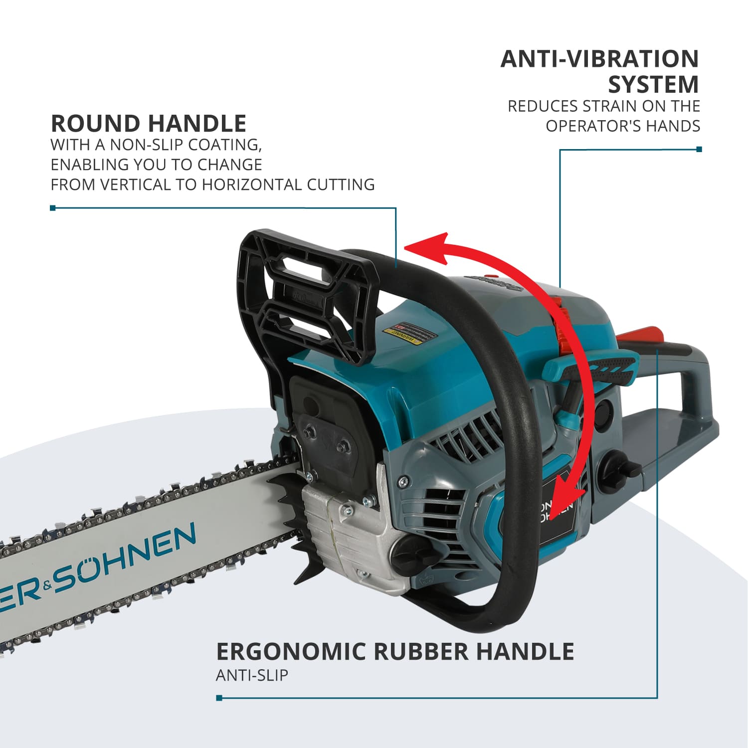 - MÂNER ROTUND: Mânerul în formă de arc al drujbei este o caracteristică importantă care îmbunătățește semnificativ confortul, permițându-vă să alegeți cu ușurință orice unghi de tăiere și să treceți de la tăieturi verticale la orizontale cu o precizie excepțională.