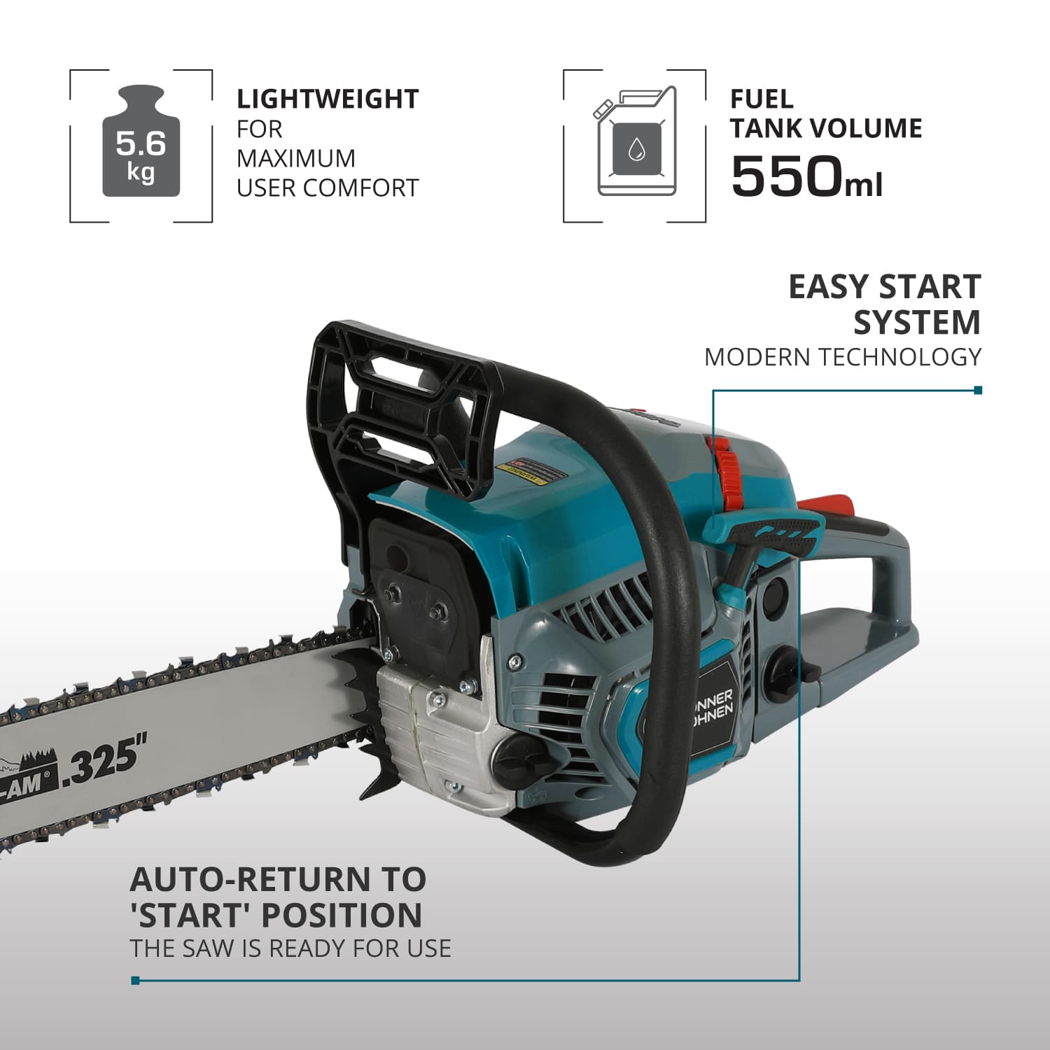 Butonul de oprire al drujbei revine automat în poziția START. Datorită acestei caracteristici, drujba este întotdeauna gata de pornire, permițându-vă să vă concentrați asupra muncii fără a fi distras de detalii minore.