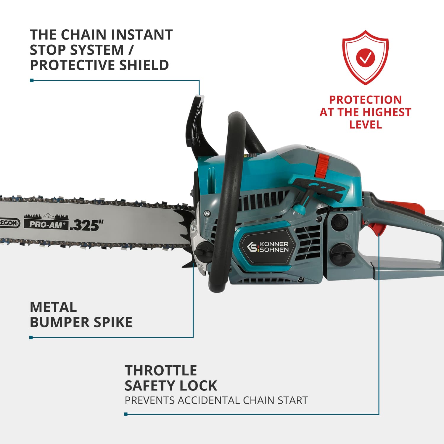 PROTECȚIE DE NIVEL ÎNALT: Motoferăstraiele pe benzină Könner & Söhnen® sunt echipate cu caracteristici de siguranță integrate.