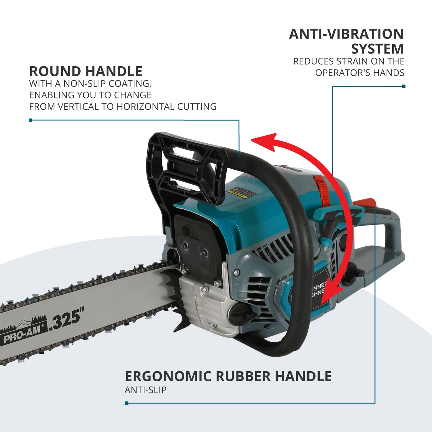 - MÂNER ROTUND: Mânerul în formă de arc al drujbei este o caracteristică importantă care îmbunătățește semnificativ confortul, permițându-vă să alegeți cu ușurință orice unghi de tăiere și să treceți de la tăieturi verticale la orizontale cu o precizie excepțională.
