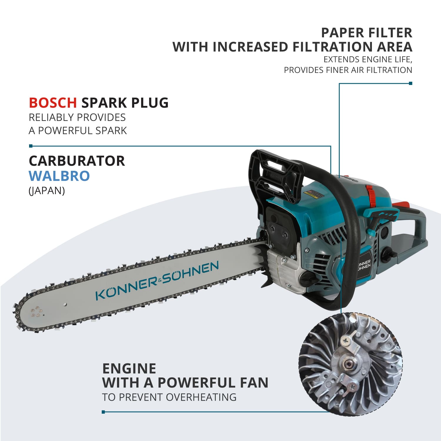 - EFICIENȚĂ RIDICATĂ A MOTORULUI: Motoarele de drujbă pe benzină Könner & Söhnen sunt cunoscute pentru fiabilitatea lor ridicată și rezistența la uzură, asigurând o durată lungă de viață. Sistemul de alimentare cu combustibil în patru canale asigură amestecarea optimă a amestecului de aer-combustibil pentru cea mai eficientă combustie, ceea ce reduce substanțele nocive din gazele de eșapament și maximizează eficiența consumului de combustibil.