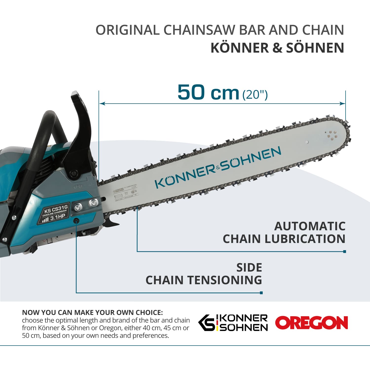 - FLEXIBILITATE ÎN ALEGEREA COMPONENTELOR: În funcție de diametrul și tipul lemnului care urmează să fie tăiat, puteți alege lungimea potrivită a barei și lanțului pentru o operare eficientă. Barele și lanțurile de la Könner & Söhnen® și Oregon sunt disponibile.