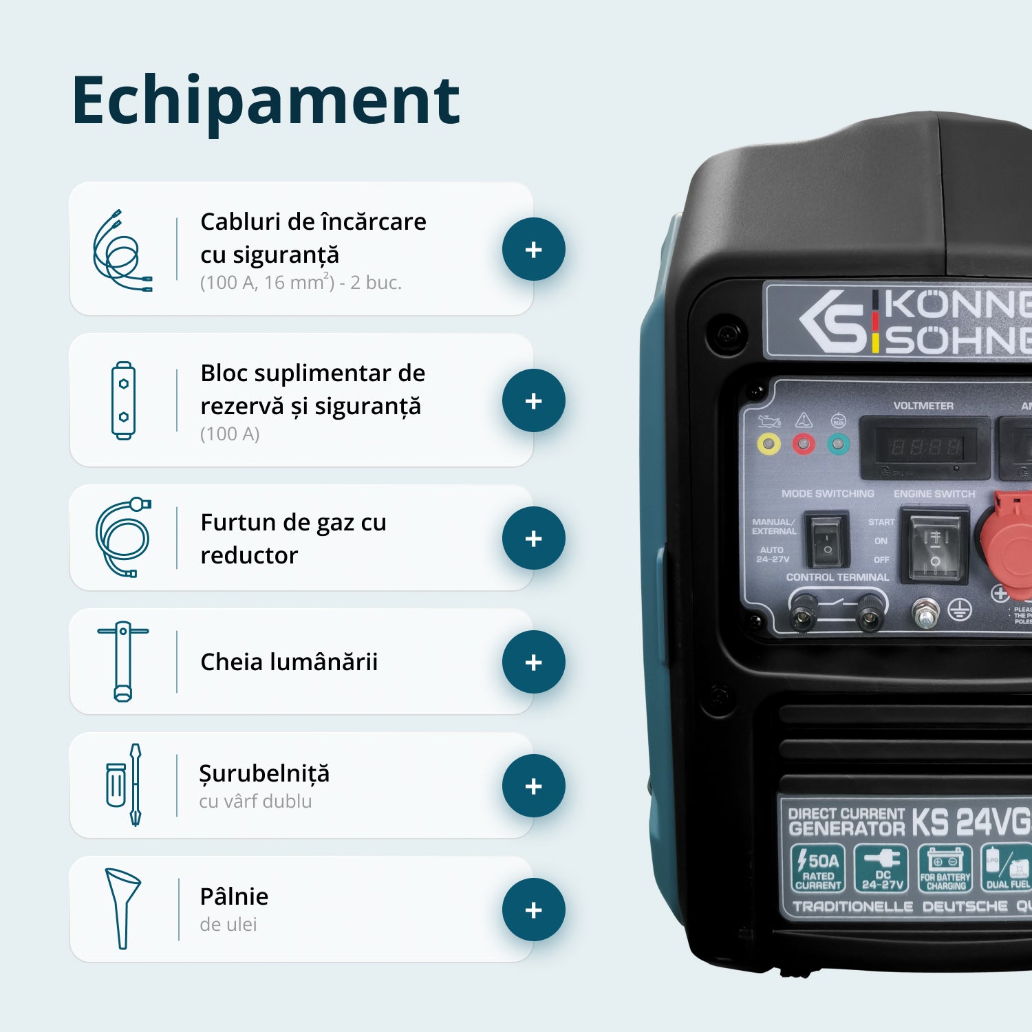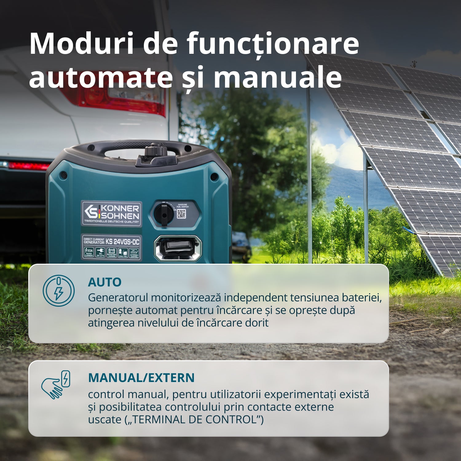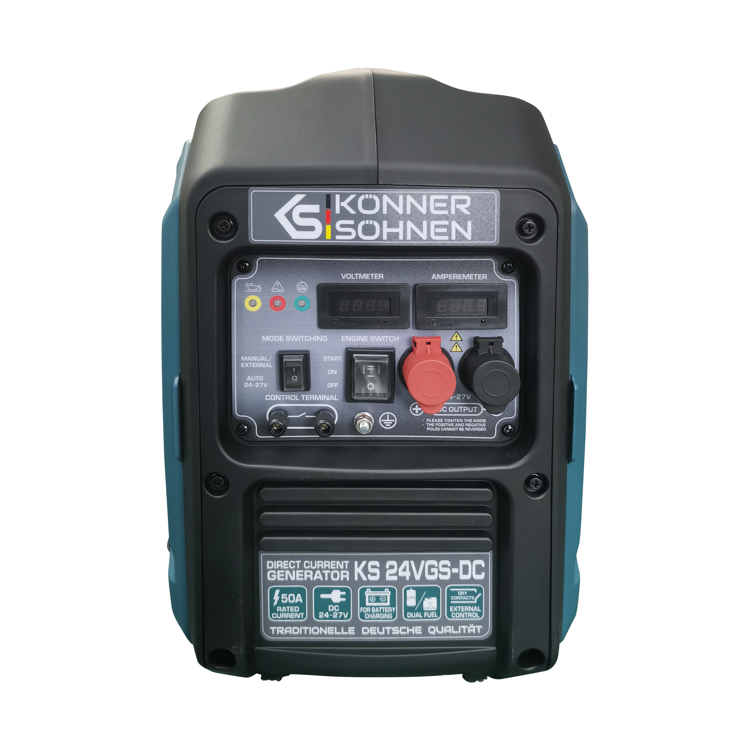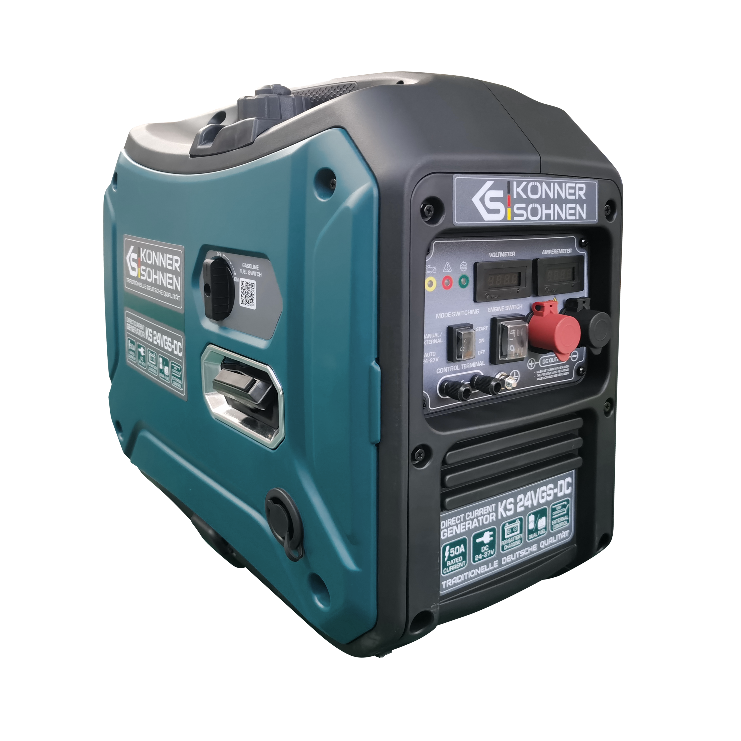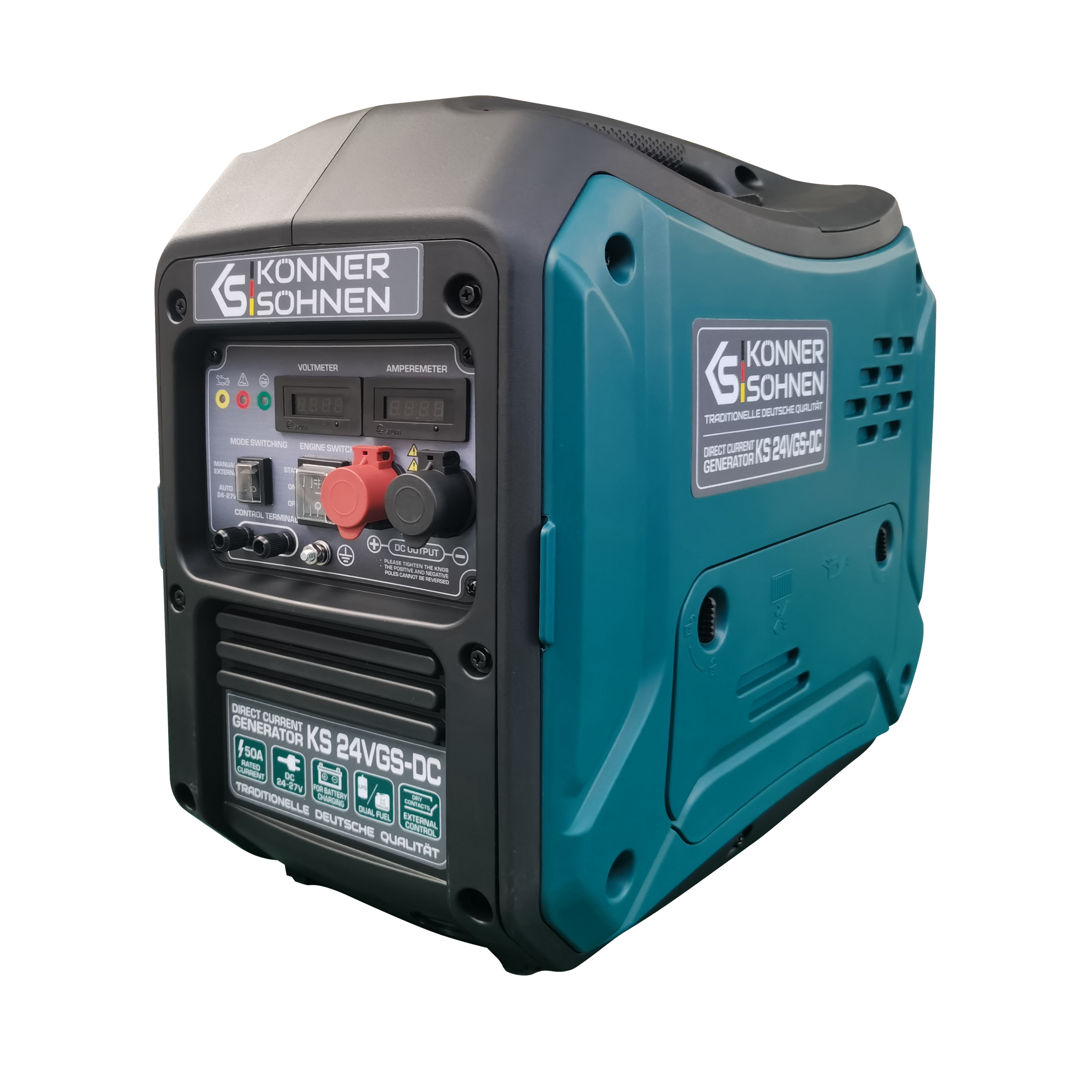 Generatorul DC 24-27V 50A cu sistem dual fuel de la marca germană Könner & Söhnen® este proiectat ca un încărcător de rezervă pentru acumulatori24V, combinând eficiența cu confortul. Încărcarea directă este eficientă fără conversii de tensiune suplimentare. Economie de combustibil comparativ cu generatoarele AC. Modul AUTO controlează automat încărcarea acumulatorului. Panoul de control este ușor de utilizat. Ideal pentru stații solare, telecomunicații și alte aplicații. Funcționează cu benzină sau GPL. Carcasa fonoizolantă reduce zgomotul.